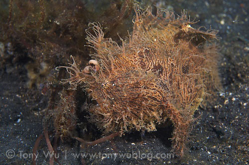This is picture of a female hairy frogfish (Antennarius striatus). When I took this photo, she was clearly hungry, as she unfolded her worm-like lure and started wiggling it around, fishing for a meal...as frogfish do.