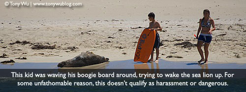 - On the one occasion when the patrol boat came by, just like I witnessed last year, one of the CALM representatives went ashore, spoke with a few people, then left. Everyone behaved well while he was around, then promptly returned to doing whatever they were doing before he showed up, including shouting at the sea lions, waving boogie boards at them, sending little kids to pose by big bulls with big teeth, and so forth. (This would be comical, if not so tragic.)
