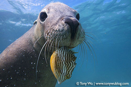 Long story made short, my sea lion companion led me over to a patch of sea grass, where instead of lying down and scratching his back, he poked around for a bit, peeked knowingly "over his shoulder" a couple of times at me, then suddenly presented me with a pretty little boxfish. The smug look on his face was unmistakable.